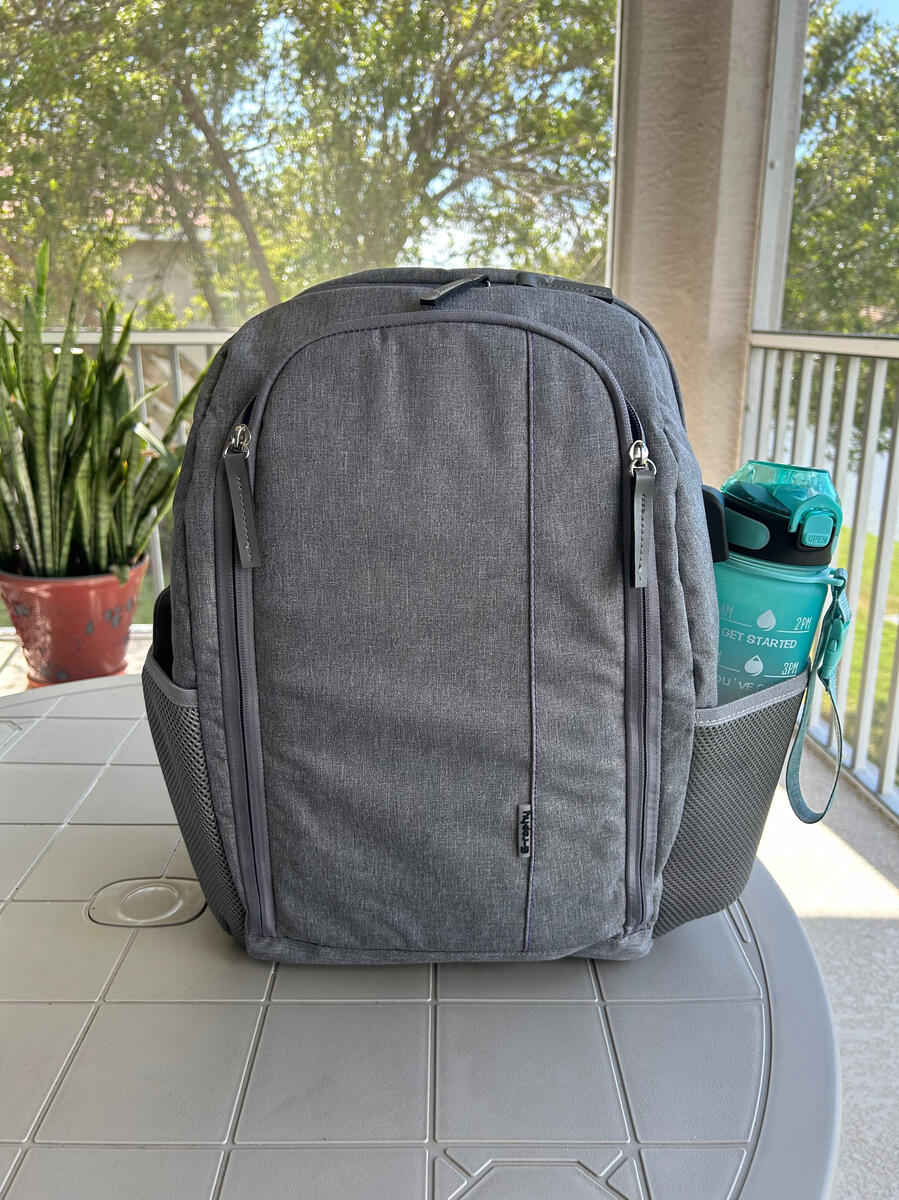 This G-raphy camera backpack is literally perfection. It's medium sized and extremely well made. The pockets on the sides are stretchy enough to fit my water bottle. It has ALOT of cushion to keep my gear safe. And the inside is purple which makes me extra happy. And yes, I always carry baby wipes just in case.