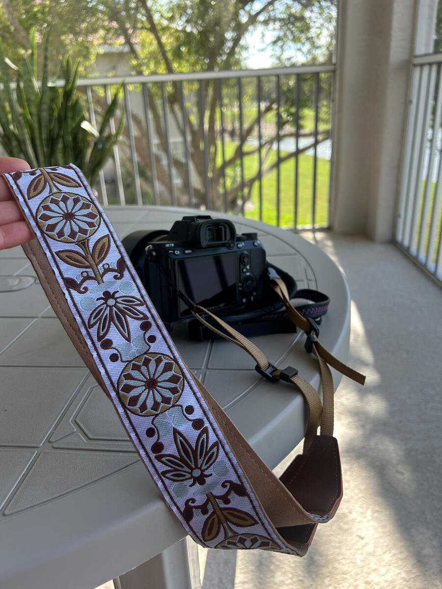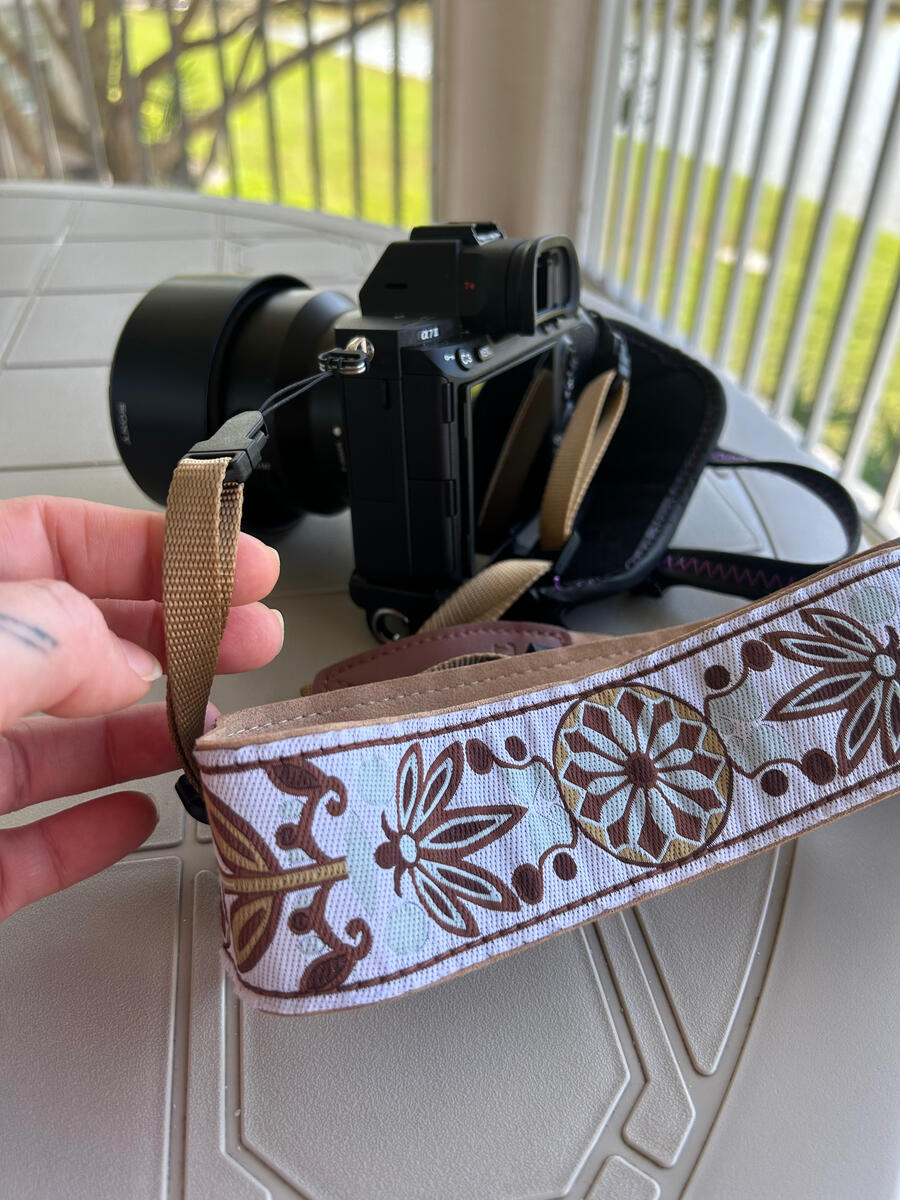 I use this Art Tribute neck strap to take pressure off my hands between shots and also to secure my camera in case my hand strap fails. This specific one has worked for me flawlessly. I love how long it is and the design is gorgeous. One thing I really want to emphasize(as pictured in image number 3) is that for my set up I hooked both the neck and hand strap to the same connection loop. I decided to do it this way so I have double protection in case one strap fails since I can’t grip the camera with my right hand.