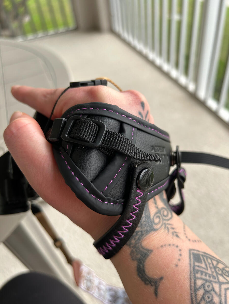 After my nerve injury, gripping a camera the normal way became difficult. This setup lets me cradle the camera securely while triggering the shutter with my left hand. The strap supports the weight, the mounted trigger replaces the shutter button, and the accessories make it possible for me to keep shooting without putting stress on my injured hand.