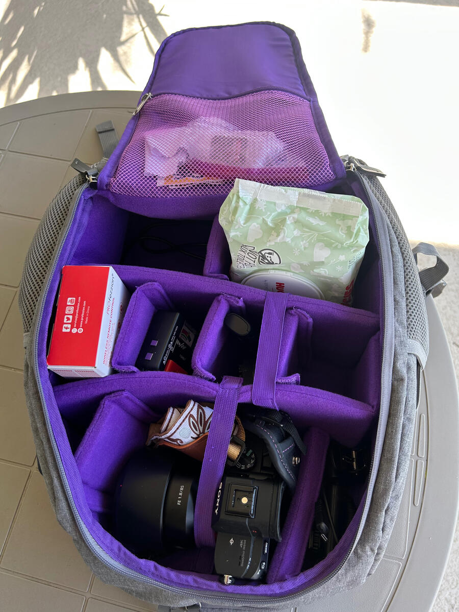 This G-raphy camera backpack is literally perfection. It's medium sized and extremely well made. The pockets on the sides are stretchy enough to fit my water bottle. It has ALOT of cushion to keep my gear safe. And the inside is purple which makes me extra happy. And yes, I always carry baby wipes just in case.
